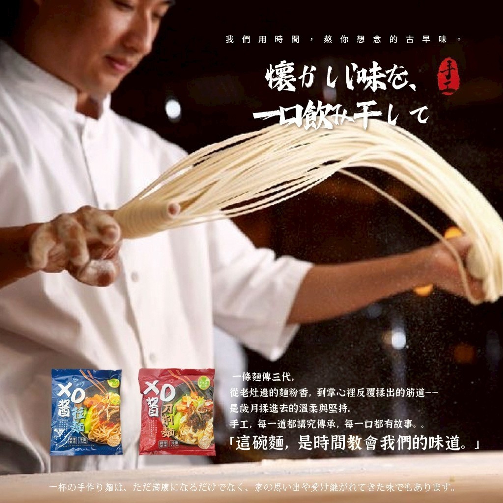 XO醬雙麵對決🔥 🍜【今天想吃哪一碗?】 兩款可挑 XO醬拉麵|滑順吸醬,辣香直衝味蕾! XO醬刀削麵|厚實Q彈,醬汁牢牢附著! ☀️ 手工日曬麵條:自然日光低溫慢曬,麵香更濃郁、Q度更扎實! ✨ #嘴饞限定 ✨ #醬香爆擊 ✨ #麵控的天堂 💡 最聰明的吃法 👉 雙入組合一次帶走,兩種口感一次滿足! 🍜 XO醬麵條,就是懶人神麵+醬香爆擊! 嘴巴被照顧到,心情也跟著好起來 😌 上班腦袋打結、下班懶得想晚餐? 這兩款香到升天、Q到上癮的XO醬麵,直接救場! 🌶️ 獨家爆香XO醬:干貝×蝦米×辣椒精華交織 🍜 雙麵口感PK:拉麵滑順 VS 刀削厚實 ⚡ 懶人神麵:快速上桌,宵夜、加班、追劇都靠它! 🏆 雙麵PK介紹 🅰️ XO醬拉麵:滑順入味,辣香直擊味蕾,停不下來! 🅱️ XO醬刀削麵:厚實帶勁,咬感滿分,每一口都爆香! 😋😘 小編偷爆料:任選雙入最聰明,兩種口感一次滿足! 💬【吃過都說香!回購率超狂🔥】 📍 加班需要即刻療癒 📍 追劇宵夜嘴饞爆發 📍 下雨天來碗熱騰騰幸福感+100% ✨ #宵夜好選擇 ✨ #深夜食堂必備 ✨ #香辣解憂麵 👩🍳 食用方式 1.將約500CC的水煮沸。 2.放入麵條攪拌煮6-8分鐘,依喜好調整軟硬。 3.撈起瀝乾,加入醬包拌勻。 4.可加半熟蛋、青菜、蔥花更升級! ✨#XO醬控出列 ✨#疲憊料理救星 📣 你是【拉麵派】還是【刀削派】,2款都帶回家比拚吧!!! 重量:130公克(麵體90公克、XO醬40公克) 有效日期:如包裝標示 保存期限:12個月 產地:台灣 保存方式:請存放於通風陰涼處,請勿置於高溫、潮濕、日光直射之場所。 過敏警告:本產品含有麩質之穀物及其製品、小麥、甲殼類、大豆及其製品,不適合對其過敏者食用。