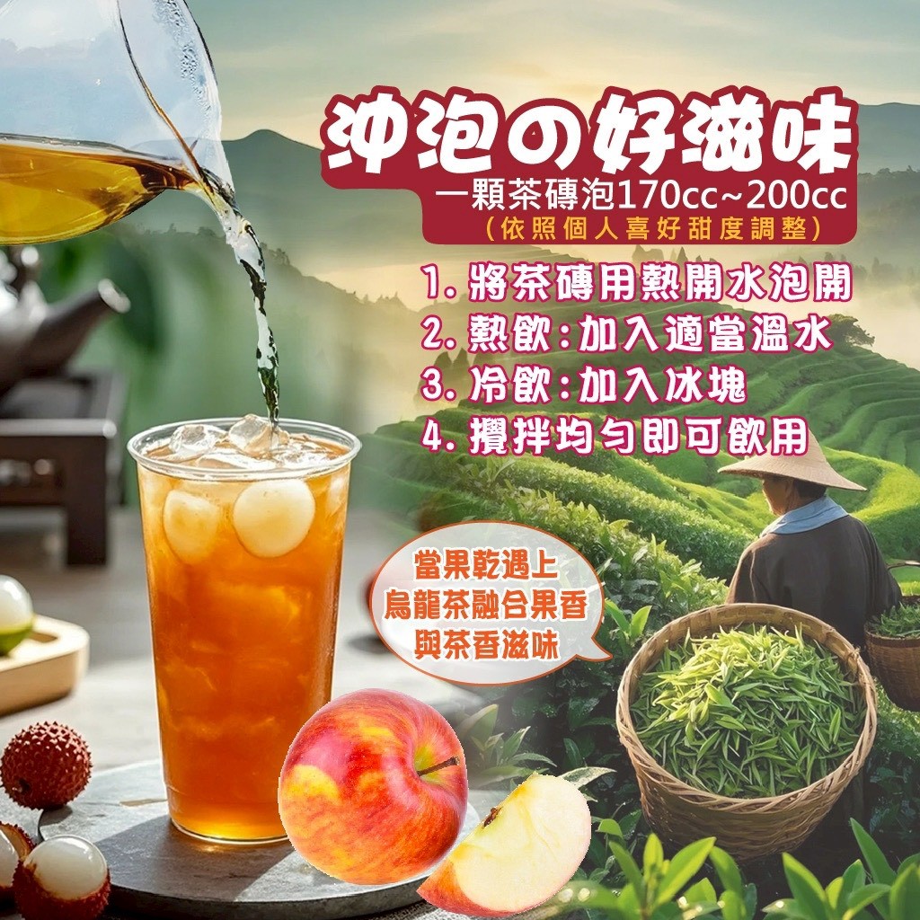 🛒一口甜潤,夏日果茶盛宴!精選優質長葉茶葉,甜潤蜜桃般的香甜, 口感香甜順滑,入口甘甜爽口。氣泡瞬間爆裂,茶香果香沁人心脾, 佛系食味完美,夏日清爽暖心。😱 蜜桃🍑、荔枝🍒與蘋果🍎三重果香交織, 融合台灣嚴選烏龍茶🍂的甘醇清香, 一杯清爽好滋味。🥰 酸酸又甜甜,簡直是絕配💯 喝了真是來桃你歡心🥰 甜蜜到心坎裡💖 🌸神采食品🍑蜜桃遇見荔枝🍒烏龍茶磚🍂 一塊即可享有蜜桃➕荔枝➕蘋果➕烏龍茶風味 ✅🍑蜜桃香甜熟成蜜桃香氣滿溢 ✅🍒清爽多汁荔枝果香沁人心脾 ✅🍎蘋果的酸甜果韻 ✅🌿嚴選烏龍茶香清新可口 工廠已有20多年的經驗👏👏👏 而且且榮獲國際✔️ISO✔️HACCP✔️HALAL相關認證 👉專業製程,層層把關 傳承古法製糖工藝,秉持職人手工熬煮精神🔥 讓客戶可以更安心享用🥰 🔺沖泡方式: 👉熱泡:加入200c.c熱水量♨️,輕輕攪拌,待糖磚溶化後即可飲用。 👉冷泡:以80-120c.c水量的熱水溶開糖磚後,加入約4-5顆冰塊🧊飲用。 👉冷藏:以160-200c.c水量的熱水溶開糖磚後,置入冰箱冷藏。 (濃度和甜度可依照個人喜好水量多寡做調整) 📍 加入氣泡飲也超級好喝 📍 重量/淨重:170g±10%(約10顆) 有效日期: 如包裝標示 保存期限:12個月 保存方式:請置於通風乾燥處,避免陽光直射及潮濕,開封後需冷藏。 產地:台灣