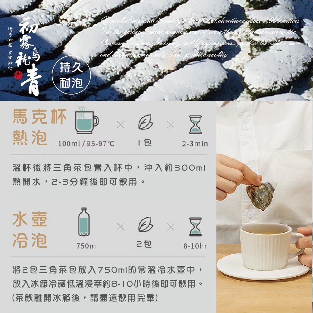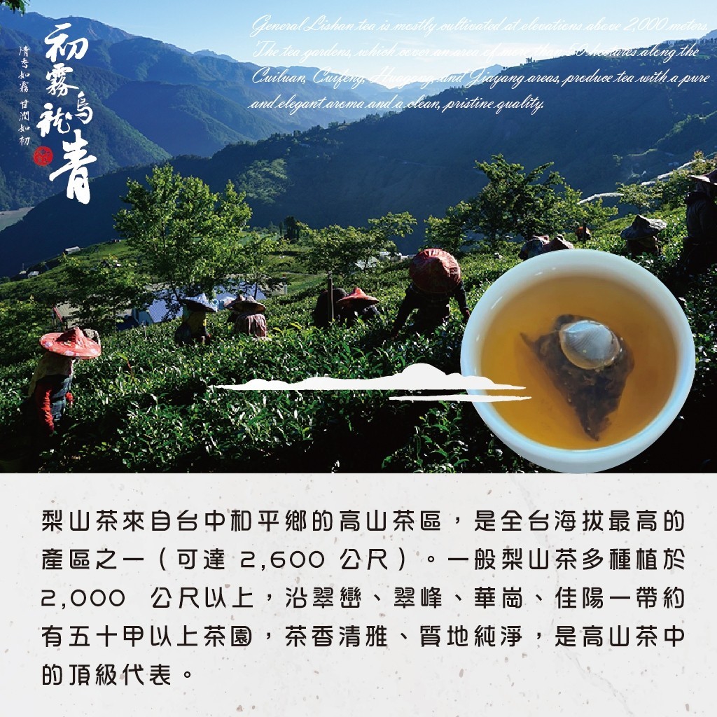 選用台灣梨山青心烏龍原葉,低發酵呈現細緻清香。