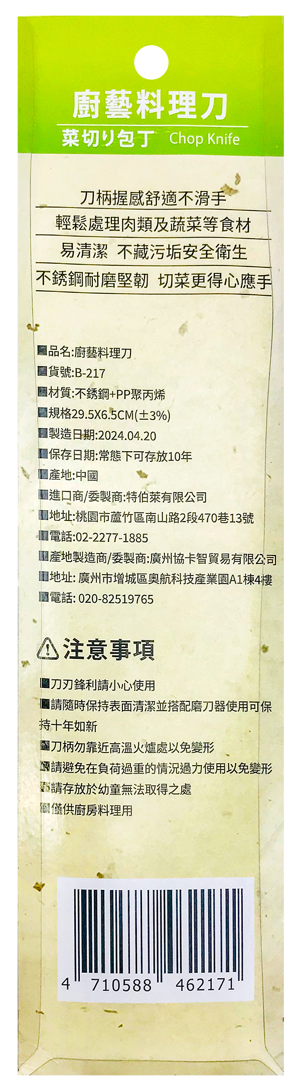 刀柄握感舒適不滑手 輕鬆處理肉類及蔬菜等食材 易清潔 不藏污垢安全衛生 不銹鋼耐磨堅韌 切菜更得心應手 【商品資訊】 材質:不銹鋼+PP聚丙烯 規格:29.5x6.5cm(±3%) 產地:中國