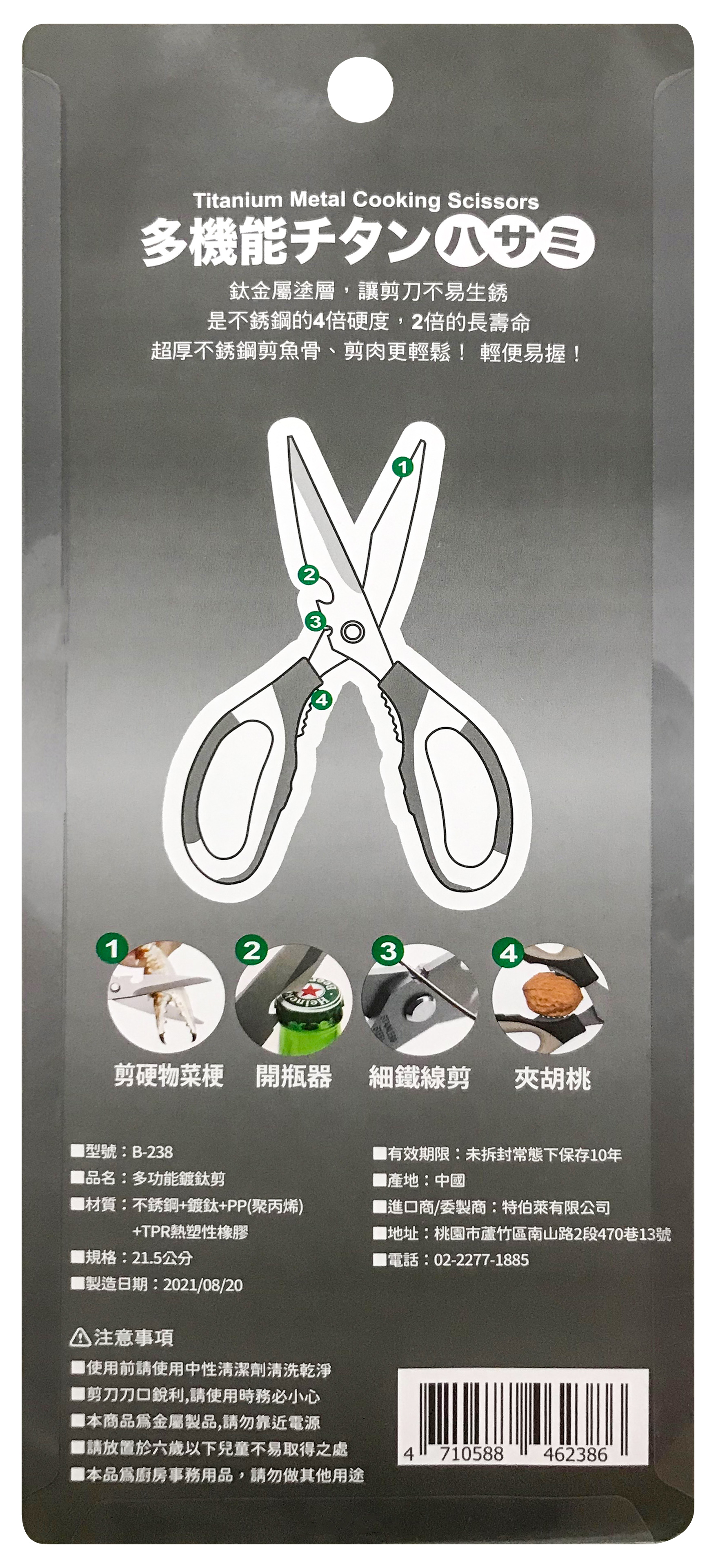 鈦金屬塗層,讓剪刀不易生銹 是不銹鋼的4倍硬度,2倍的長壽命 超厚不銹鋼剪魚骨、剪肉更輕鬆,輕便易握! 材質:不銹鋼+鍍鈦+PP(聚丙烯)+TPR熱塑性橡膠 規格:21.5cm 產地:中國