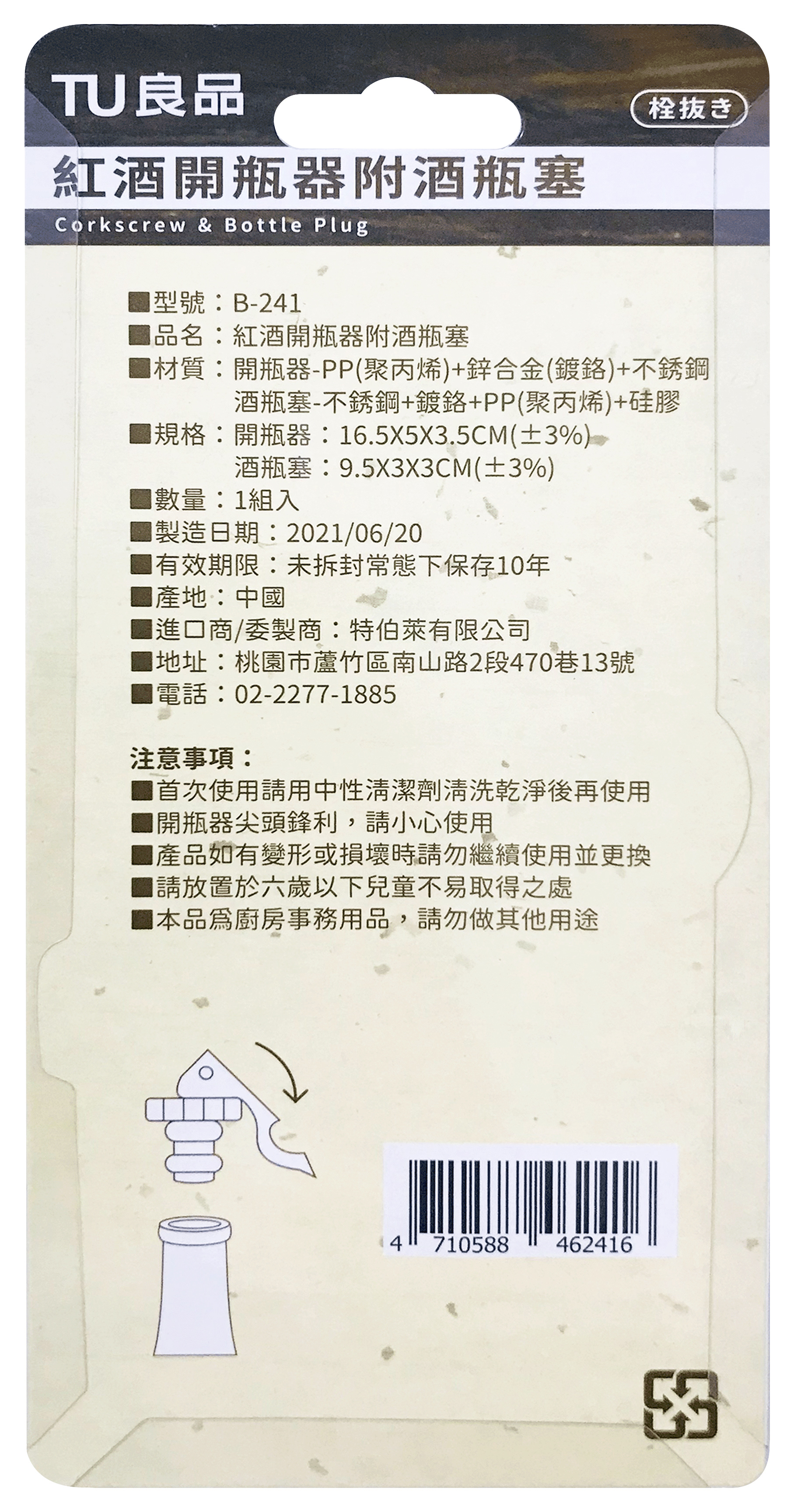 材質:開瓶器-PP(聚丙烯)+鋅合金(鍍鉻)