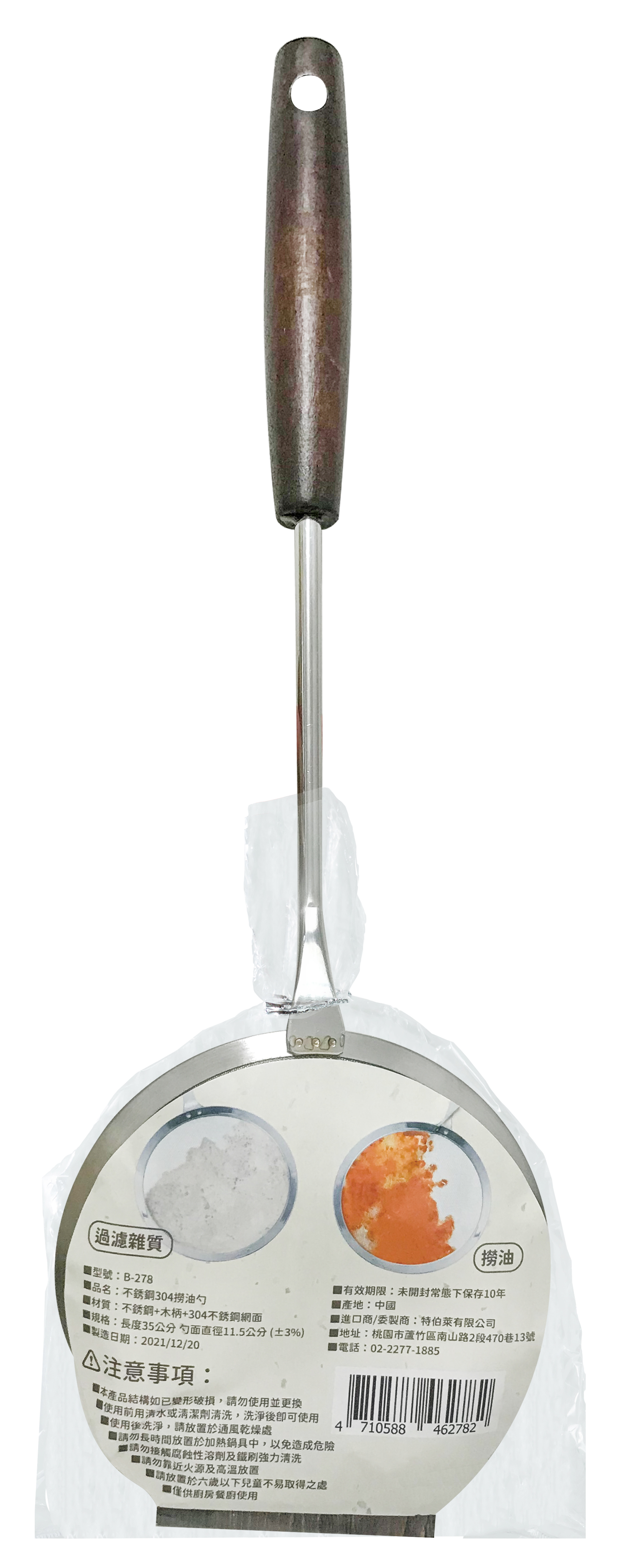 304不銹鋼安全耐用 可撈油可過濾雜質 貼心吊掛設計 【商品資訊】 材質:304不銹鋼 規格:長度35cm 勺面直徑11.5cm(±3%) 產地:中國