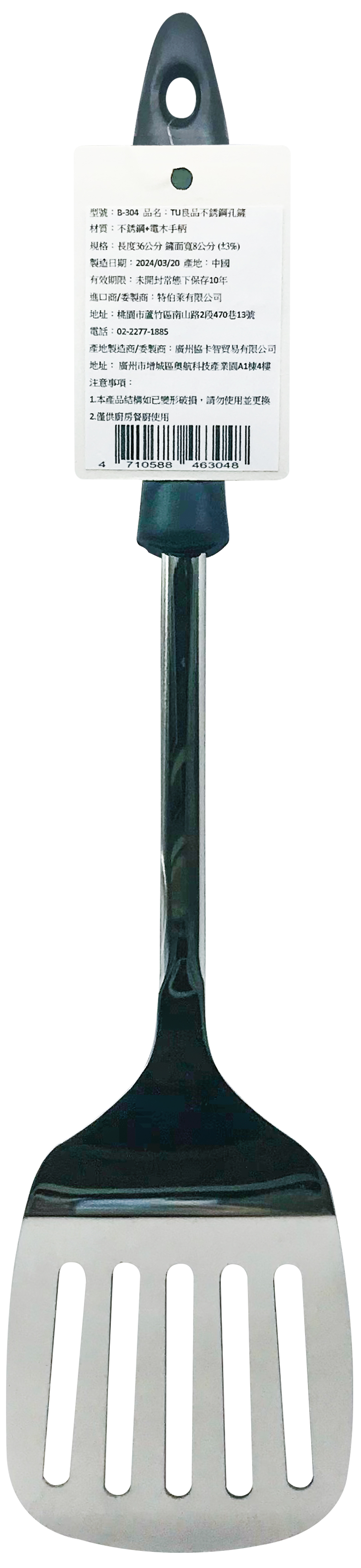 堅固耐用,易清洗,握把設計舒適好握 手持握把尾端採可掛式設計,即使晾乾收納也不佔空間 材質:不銹鋼+電木手柄 規格:長度36cm 鏟面寬8cm(±3%) 產地:中國