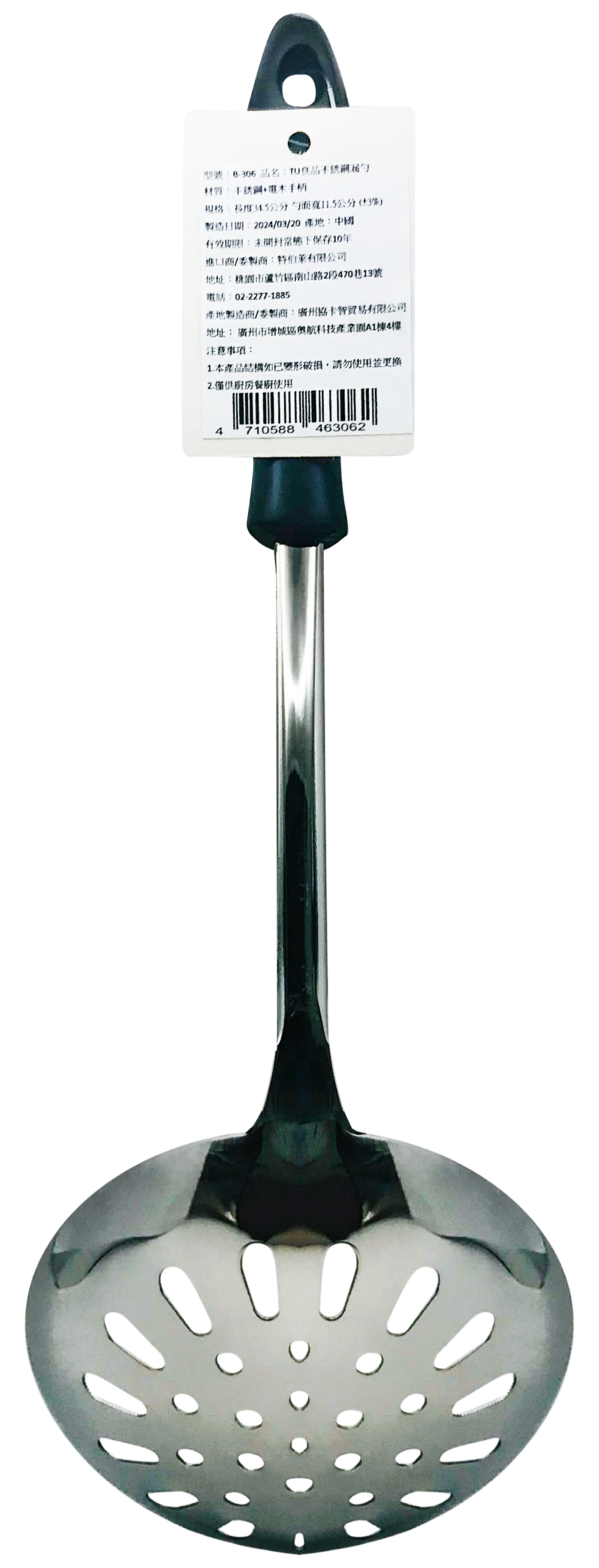 堅固耐用,易清洗,握把設計舒適好握 手持握把尾端採可掛式設計,即使晾乾收納也不佔空間 材質:不銹鋼+電木手柄 規格:長度34.5cm 勺面寬11.5cm(±3%) 產地:中國