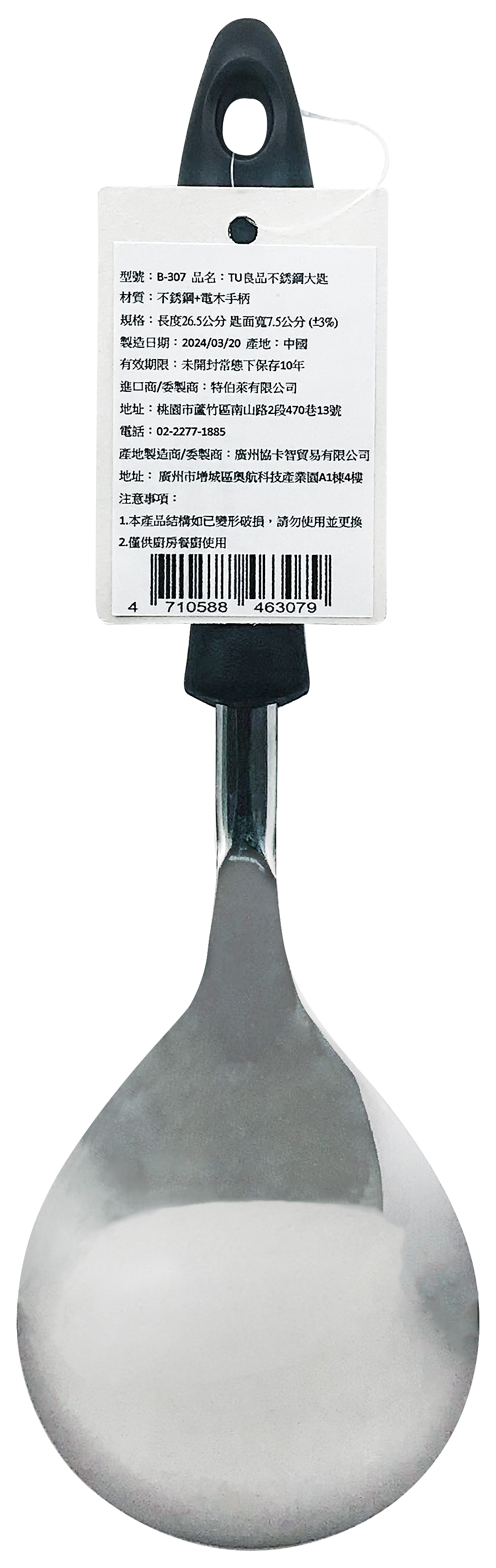 堅固耐用,易清洗,握把設計舒適好握 手持握把尾端採可掛式設計,即使晾乾收納也不佔空間 材質:不銹鋼+電木手柄 規格:長度26.5cm 匙面寬7.5cm(±3%) 產地:中國