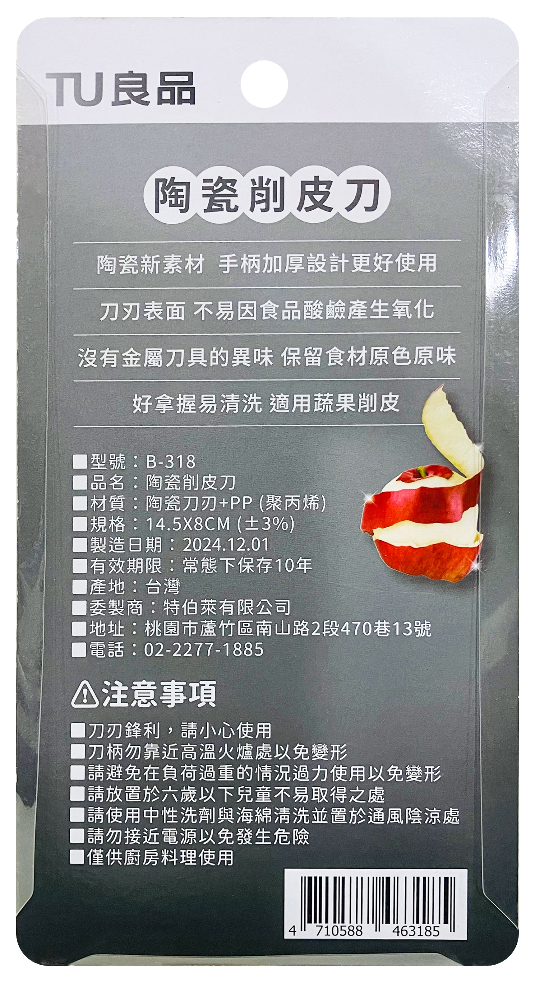 陶瓷新素材,比傳統鋼材耐用 刀刃表面,不會因食品酸鹼產生氧化 沒有金屬刀具的異味,保留食材原色原味 好拿握易清洗。 適用蔬果削皮、處理蔬果細部瑕疪 【商品資訊】 材質:陶瓷刀刃+PP(聚丙烯) 尺寸:14.5x8cm(±3%) 產地:台灣 保存期限:常態下保存10年