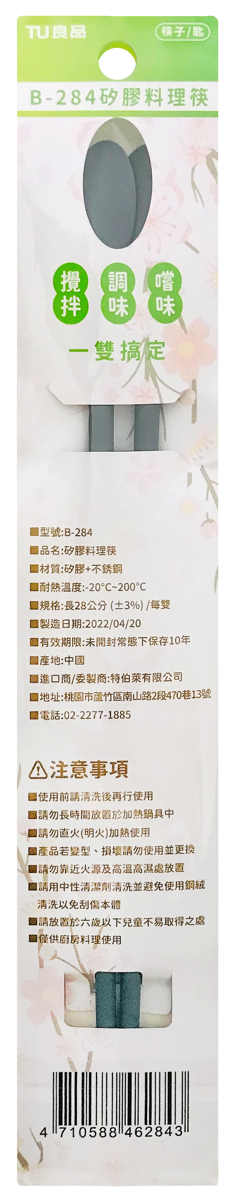 彈性耐熱矽膠筷匙設計 好拿握好施力 攪拌、調味、嚐味一雙搞定 筷子-矽膠防滑處理可輕鬆夾取食材不易掉落 匙-料理時可輕鬆加入調味料方便嚐味 材質:矽膠+不銹鋼 規格:長度28cm (±3%)/每雙 產地:中國