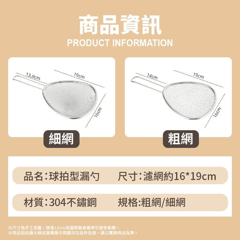 👩🍳 炸物控、湯麵控、廚房新手通通適用! 👉 一支就搞定撈、濾、瀝、洗各種需求! ✨ 【產品特色】 🔹 兩款網孔任你選 ✔ 粗網:適合撈炸物、蔬菜、餃子 ✔ 細網:適合撈豆腐、過濾湯渣、茶渣 🔹 橢圓球拍造型|撈得多、省時間 ✔ 網面寬大,快速撈取 ✔ 平衡手感更好 🔹 食品級304不鏽鋼|耐用不生鏽 ✔ 抗腐蝕 ✔ 不殘味 ✔ 易清洗 ✔ 堅固耐用 🔹 長柄設計|遠離油煙不燙手 ✔ 吊掛收納 ✔ 廚房不雜亂 ✔ 使用更安心 🛒 廚房必備神器|炸鍋族 & 湯控們的最愛! 📣 現貨供應中,2款都買起來吧~~~! 【★商品規格】 材質:304不鏽鋼 規格:濾網約16*19cm,手柄13.8cm
