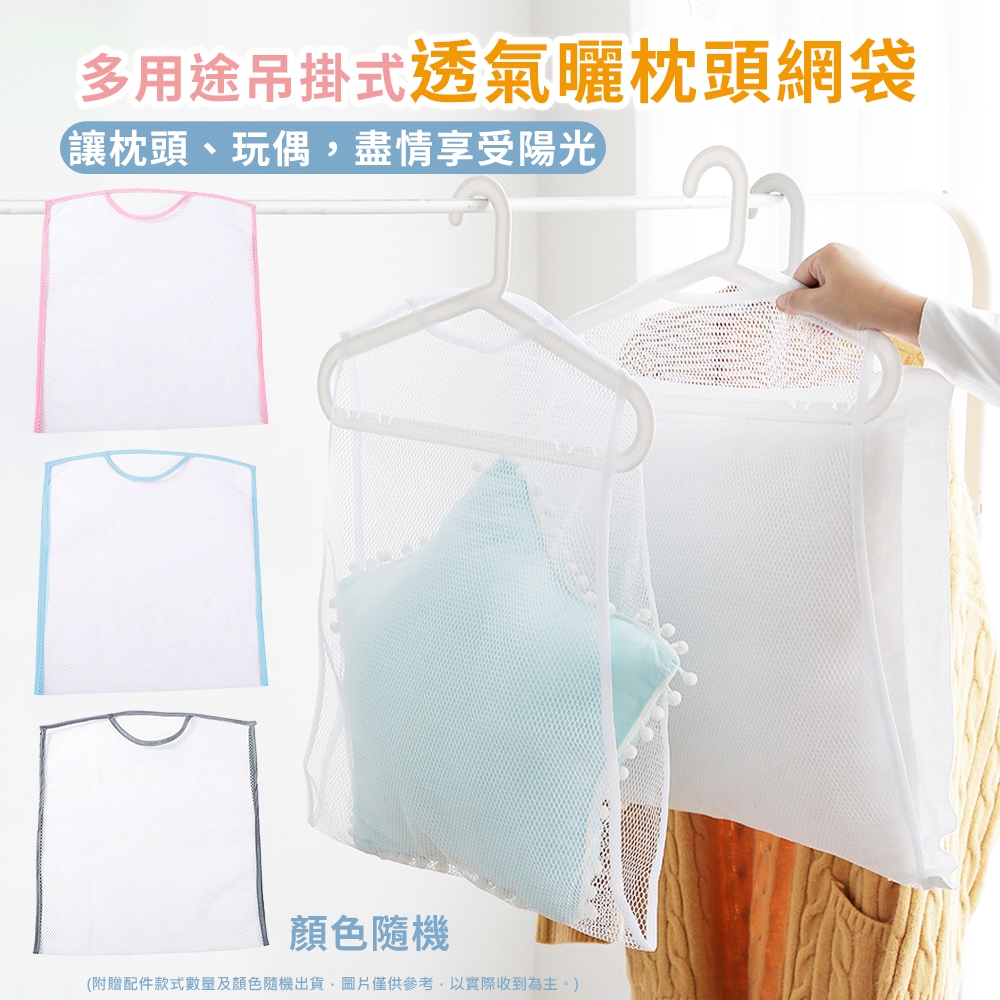 曬枕頭、曬娃娃總是讓你很頭痛⁉️ ❌體積太大不易固定 ❌使用曬衣夾容易變形 ❌大風一吹掉落地 ☀️多用途吊掛式透氣曬枕頭網袋☀️ 一網多用👉🏻可收納👉🏻可晾曬 多功能可晾曬小物件 也可當作日常衣櫃收納使用 💓包裹式紗網輕鬆固定枕頭,網格透氣又通風 💓衣架開口處的設計,一般衣架皆能使用 💓免使用曬衣夾,不怕枕頭拉扯、變形 精緻包邊,不易脫線,更加堅固耐用! 適用於各種不易固定於衣架,卻有晾曬需求的物品 枕頭、玩偶、椅墊、抱枕、包包、鞋子…等 【尺寸】約33x45cm 【顏色】多種顏色/隨機出貨 【包裝】袋裝