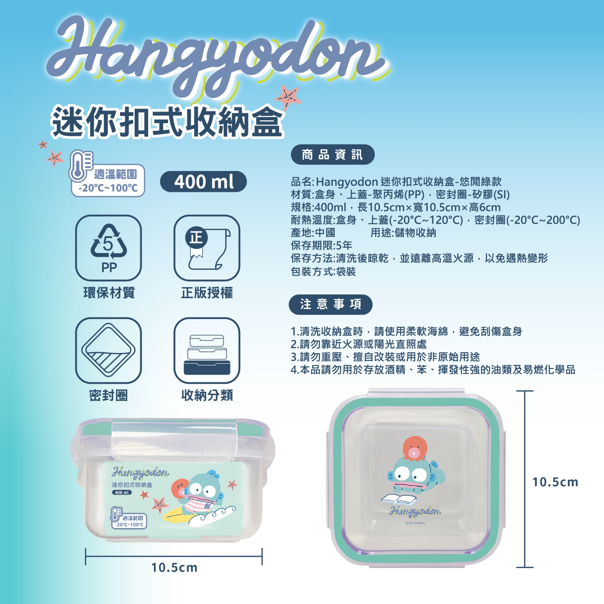 桌面一堆小物散亂一團😩 吃不完的小菜、零食不知如何收納😩 🐟跟著漢頓一起收納去🐟 迷你扣式收納盒✨ ✨400ml容量✨大小剛剛好 🥡最適合收納桌面小物 🥡食材保鮮喔! 能夠幫你桌面收納 📎像是迴紋針、小夾子、髮圈等各種小物 🧻或是壓縮棉柔巾、小包濕紙巾 🍪吃不完的餅乾、糖果也能收納保鮮起來 是您儲物收納好幫手🫶 適溫範圍-20~100度C❄️🔥 🥡熟食也能裝 🥡也可放在冰箱冷藏食材 ✨四面環扣和矽膠條設計 能夠完全密封,滴水不漏! 保鮮食材有一套! ✨透明盒身 裝什麼都一目了然 直接拿取你要的👀 ✨卡槽設計 可堆疊且放置平穩 向上疊放更節省空間👍 能用於日常收納🌈食物保鮮🌈 🐟人魚漢頓迷你扣式收納盒🐟 是你的萬能收納小幫手👍 【規格】400ml 【材質】盒身、上蓋-聚丙烯(PP)、密封圈-矽膠(SI) 【尺寸】約10.5x10.5cm