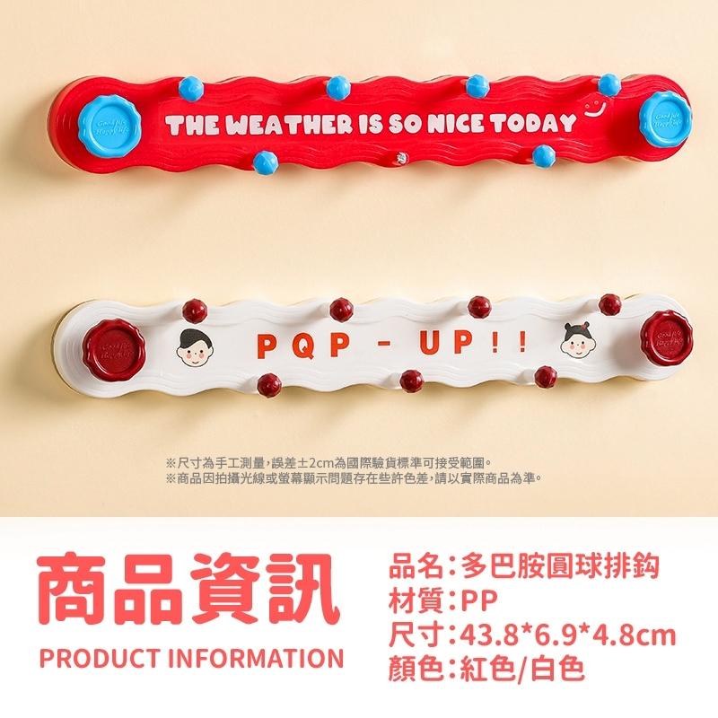 🌸【木棉花】多巴胺無痕吸盤圓球排鉤 💥 免打孔|強力吸附|隨心收納 🉐 打造繽紛生活感,收納更有美感! 🎨 多巴胺色彩設計 亮眼圓球造型,增添居家氛圍,實用與美觀兼具。 ✨ 產品特色 ✔ 免打孔設計:無痕吸盤,牆面不留痕跡 ✔ 強力承重:牢固吸附,不易脫落 ✔ 一秒安裝:右旋即吸附,左旋可拆卸移動 ✔ 隨心調整:想掛哪裡就掛哪裡,靈活又方便 ✔ 多場景使用:浴室、廚房、玄關、房間門後皆適用 🏠 適合掛放 毛巾|浴球|鑰匙|圍裙|小包|廚房工具 👉 小物有序收納,生活更整潔! 【★商品規格】 規格:43.8*4.8*6.9cm 材質:PP 顏色:白
