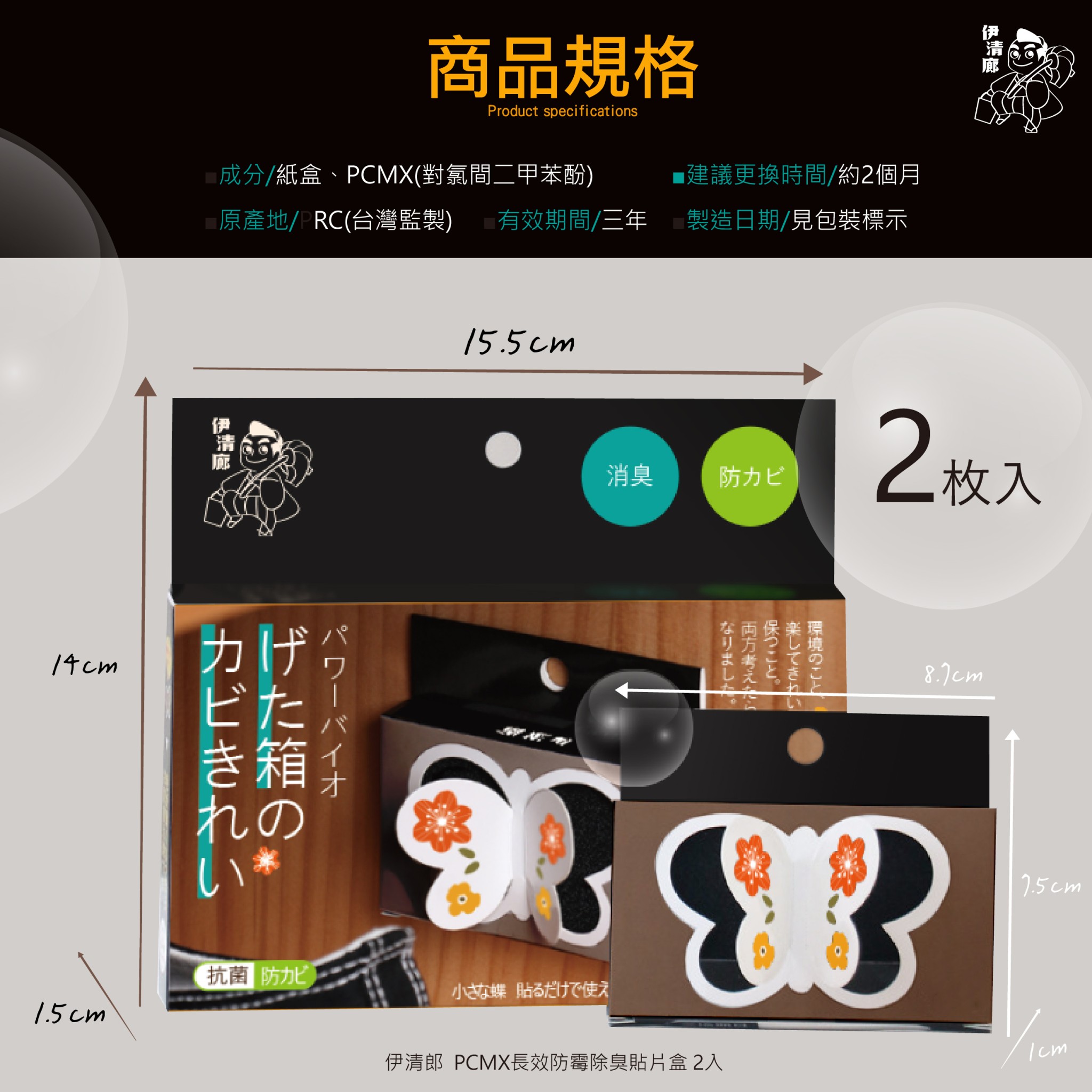 橫掃美、日、韓,市場🏅 秒殺所有海內外的購物籃🧺 就連隔壁鄰居都來詢問哪裡買的 您如果還沒聽過就跟不上潮流購物清單啦!! +2 = 4枚入🦋 台灣的高濕氣候🌧️隨之而來的是霉菌與細菌🦠 長滿霉菌跟滿滿濕氣的衣櫃的求救聲您聽到了嗎‼️😰 充滿鹹魚味跟細菌的鞋櫃的呼喊聲您聽到了嗎⁉️ 📢伊清廊全新開發的PCMX長效防霉除臭貼片盒📢 🏆擁有美國🇱🇷FDA批准的首選抗霉成分PCMX 不只讓您的鞋櫃不再遭受臭味的迫害🫵 也讓您的衣櫃瞬間變成小清新✨ 📌吊掛地點: ✔️衣櫥✔️鞋櫃 ✔️收納櫃 ✔️陰暗潮濕的櫥櫃 ✔️小型儲藏室 📌使用優點: 長時間高效除霉共可使用1片/60天 小巧不占空間 【尺寸】外盒約15.5*14*1.5cm/防霉貼片盒約8.7*7.5*1cm 【內容】防霉貼片盒 (2盒/組)4入 【適用】鞋櫃/衣櫃 【材質】紙、蜂窩泡棉內芯、PCMX(對氯間二甲苯酚) 【有效期間】3年 【產地】PRC(台灣監製)
