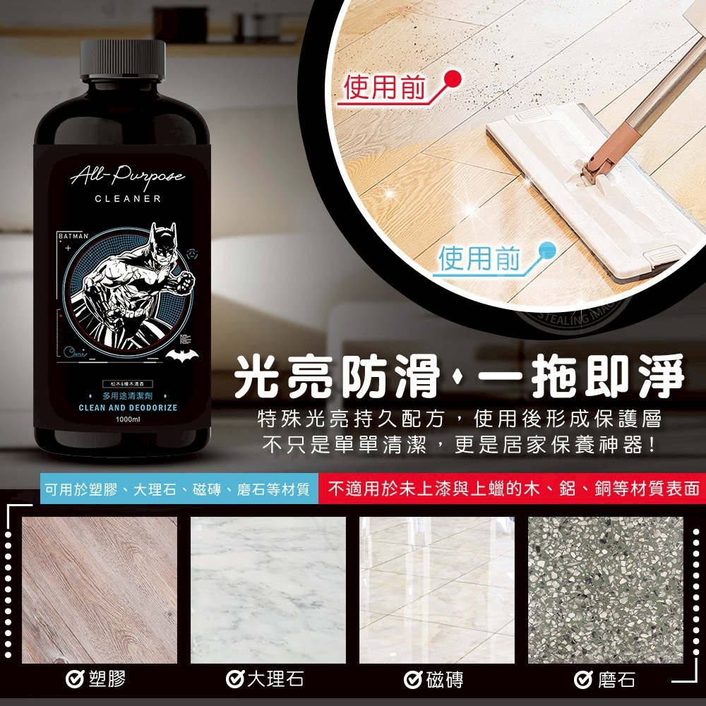 ⭐️家務達人的秘密武器⭐️ #這瓶清潔劑就是你的救世主! 讓你的環境煥然一新,閃閃發光✨ 🦇蝙蝠俠松香檜木多用途清潔劑🏆 就像你身邊的隱形英雄,幫助你保持居家清潔和健康⚡️ 讓你的家也能像蝙蝠城一樣乾淨又無懼挑戰! 🌲天然松香&檜木香 是蟲蟲最害怕的味道 ✨不僅讓地板清潔溜溜✨ ⛔️🐜防蟲也是一級棒⛔️🐜 🇹🇼台灣製造🇹🇼 嚴選天然植物香氛,呵護您的居家環境💕 廚房🆙洗手槽內油垢 浴室🆙有效消除污垢 廁所🆙馬桶尿垢污漬 垃圾桶🆙噴灑防蟲靠近 一瓶多用 強力去污🆗 不傷表面 溫和安全 友善環境💯 🧹一拖即淨💯輕鬆不費力 🌳天然精油成分💯一瓶抵多瓶 宜人優雅木質香氛,舒神安寧 🌈清潔不再成為煩惱,這是家庭主婦的居家必備超級神器! ✅沉靜木質香 清香不刺鼻 ✅純天然成分 溫和不傷肌 ✅無化學物質 對環境友善 ✅超強效清潔 打掃無煩惱 👊🏻從門口到臥室再從廚房到浴室 多用途清潔劑都可以應對挑戰 地板清潔、磁磚、廁所、浴缸、廚房櫃面除油 甚至噴灑垃圾桶防蟑蟲靠近,通通沒問題💯💯 清潔功能多到數不清,等你自己來發掘😎 🦇讓蝙蝠俠一起拯救整個家居環境吧⚡ 🔺使用方式:擦拭或拖地:50毫升本品兌2公升清水稀釋,如欲頑固污漬可加重劑量。 可用於塑膠、大理石、磁磚、磨石等材質 不適合用於未上漆與已上蠟的木、鋁、銅等材質表面 使用後不需再以水清潔馬桶清潔:倒入適量本品,徹底刷洗後沖水 【產地】台灣 【保存期限】3年