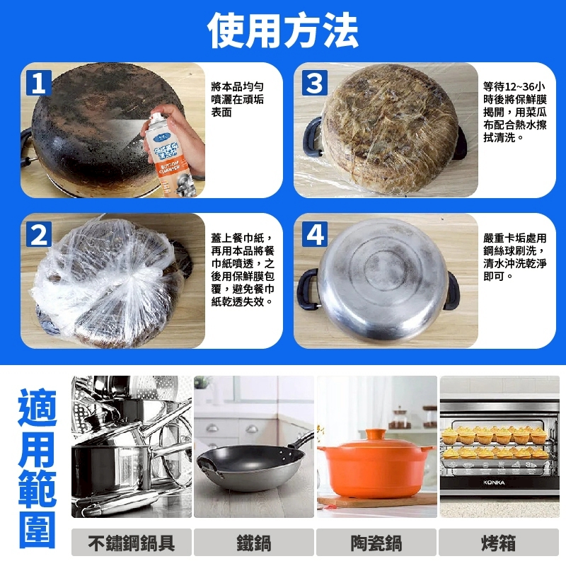 ✔ 多場景適用|鍋底、鐵鍋、瓦斯爐、排油煙機、磁磚皆可用