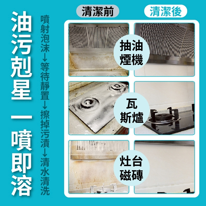 💥 急速分解 | 強力洗淨 | 廚房去油神器 ✨ 產品特色 ✔ 強效泡沫:綿密泡沫深層滲透,輕鬆瓦解頑固油污 ✔ 急速分解:抽油煙機、瓦斯爐、磁磚油垢快速溶解 ✔ 氣味溫和:檸檬清香,清潔同時清新不刺鼻 ✔ 環保配方:成分溫和,不傷廚具、不傷雙手 ✔ 多用途清潔:適用於抽油煙機、瓦斯爐、微波爐、烤箱、流理台、水槽、廚房壁面磁磚 🧽 使用方法 噴灑於油污表面 靜置片刻,待泡沫深入分解油污 用抹布或海綿輕輕擦拭,再以清水沖洗即可 👉 油垢一噴即溶,廚房潔淨如新! 【★商品規格】 產地:PRC 規格:550ml