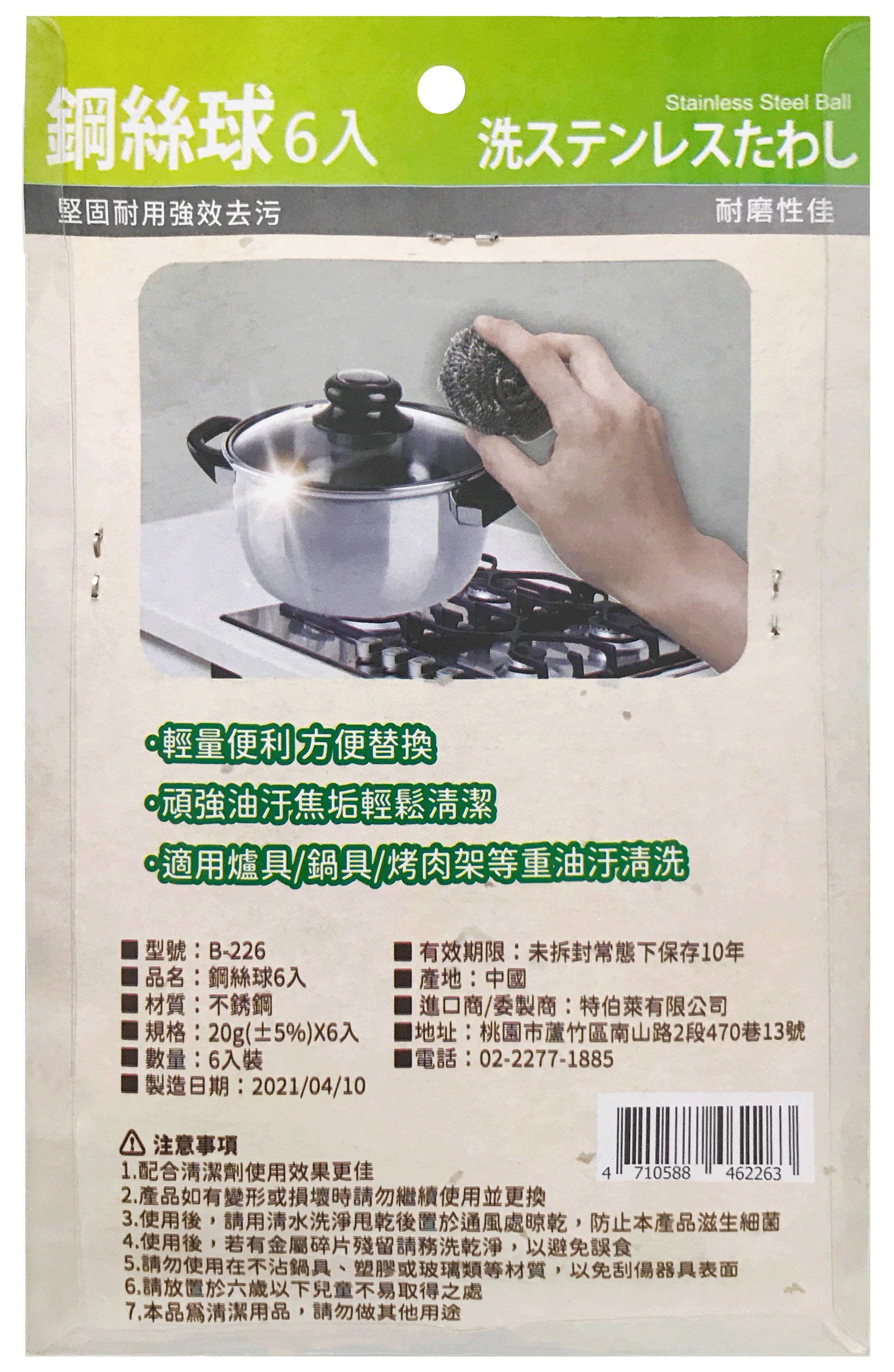 1.輕量便利 方便替換 2.頑強油汙焦垢輕鬆清潔 3.適用: 爐具/鍋具/烤肉架等重油汙清洗 材質: 不銹鋼 規格: 20g(±5%)X6入 產地:中國