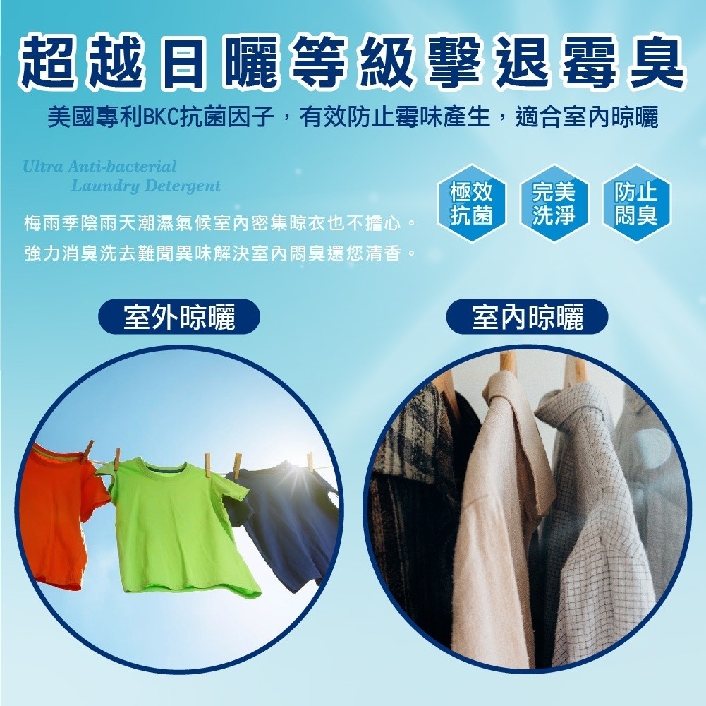 室內晾曬消臭新配方 陰曬洗衣新對策 🏆美國專利BKC抗菌防霉技術🏆 克服梅雨天☔️濕悶晾曬問題! 陰曬不發臭 就像曬過太陽一樣的乾爽 選對洗衣精很重要! 全面進化 四大功效 ⭐️極效抗菌 ⭐️完美洗淨 ⭐️防止悶臭 ⭐️香水添加 室內晾曬ALL DAY🌞陽光馨香🌞 ✅捍衛衣物清潔 分解且洗淨各種污漬 ✅深入衣物纖維 洗去髒污帶走病毒 達到抗菌效果! ✅抗菌防悶臭 高活性潔淨 無螢光劑 迷人香氛 ✅超越日曬等級 擊退霉臭 美國專利 BKC抗菌因子 有效防止霉味產生 抗菌守護超給力 晴雨兩用,在室內陰乾衣物也不怕悶臭 晾曬衣服變成一件輕鬆事 【容量】約1800ml 【產地】台灣