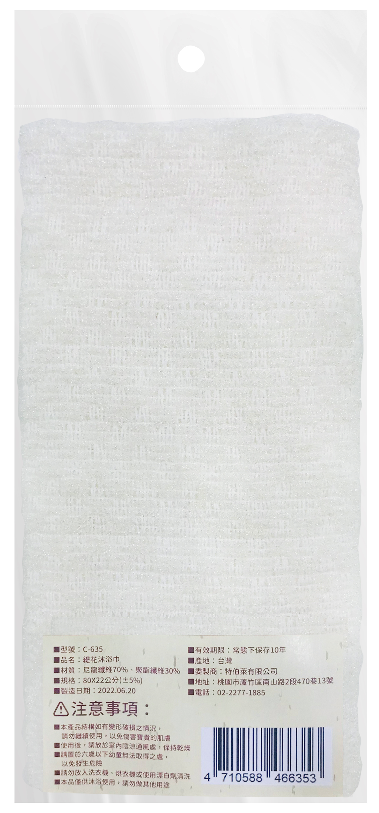 台灣製造,緹花細柔親膚設計 採取高度吸收易乾尼龍 只需少量沐浴乳或皂即可輕易起泡 材質: 尼龍纖維70%、聚酯纖維30% 規格:30x90cm(±3%) 產地:台灣