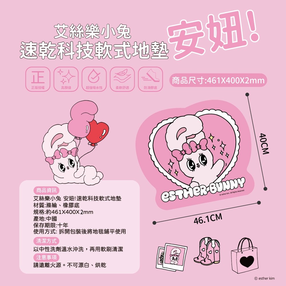 🎀高顏值的艾絲樂小兔💖💖陪你度過每個乾爽時刻😆 💦磁磚濕滑,濕漉漉的雙腳👣 可是有踩空滑倒的危機!😱 給雙腳的溫柔呵護💕 💯正版授權,優良品質👍🏻 溫柔細緻的觸感〜💞 踩踏不冰冷,親膚舒適😘 🔺底部防滑加工 追求細節,安全穩固💪🏻 增加摩擦力,不易移動!! 🔷速乾科技軟式地墊 特殊科技布料 瞬間吸水💧 濕腳踩踏 體驗乾爽出浴⚡️ 🔶真的超舒適 快速吸收水分絕佳吸力👏🏻 🤚🏻拒絕潮濕!! 給你乾爽腳感~~✨✨ ✅正版授權 ✅強力吸水 ✅親膚材質 ✅安全防滑 🐰兔粉們~ 把🉑️🉑️愛愛軟式地墊❣️❣️😍趕緊加入購物車收藏起來吧🛒 【材質】滌綸、橡膠底 【規格】約461x400x2mm 【使用方式】拆開包裝後將地毯鋪平使用 【清潔方式】以中性洗劑溫水沖洗,再用軟刷清潔 【注意事項】請遠離火源。不可漂白、烘乾