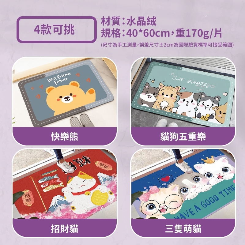 🌸【木棉花】厚實水晶絨防滑可愛地墊40*60cm 共4款:a 快樂熊、b 招財貓、c貓狗五重樂、d三隻萌貓 ❌家x福單色地墊隨隨便便都超過百元⚡ 😥要可愛款的動輒200多元 💥現在銅板價,4款都帶回家吧❗ 👉腳踏墊經常更換,保持清爽潔淨🥰 ✨精選水晶絨材質 ✅觸感柔軟舒適 ✅耐踩耐用 ✅良好隔音效果 💖讓居家生活更添溫馨與舒適 選擇這款可愛水晶絨地墊! 🌸 🏡在家長時間走動,腳底經常不舒服? 這款超柔水晶絨地墊,為你提供無與倫比的舒適觸感,無論是站著、坐著還是躺著,都能讓你感受如雲般的柔軟! ✨ 為家人打造無可挑剔的舒適居家環境! ✨ 🌈可愛圖案設計,活潑添趣🧸:不僅有超柔的觸感,還有可愛的圖案,讓你的居家環境更加溫馨、活潑,為每個角落增添一絲甜美感! 🌈水晶絨材質,手感順滑:細膩輕薄的水晶絨材質,帶來超柔毯面的觸感,每次走過都彷彿踩在雲朵上。 🌈防滑設計,穩定不移位:防滑底部設計,穩定不移位,無論走動還是坐下都安全無憂 🌈耐用韌性強,防潮防滑:給你穩定和舒適的使用感受,不論是商用還是家用,皆能應對自如! 🌈多場景適用,完美搭配每個空間:這款可愛地毯適用於客廳、臥室、廚房等多個場合,讓每一個空間都充滿溫馨與舒適,讓家人都感受到滿滿的關愛。 🌟 舒適、可愛、實用,一地毯滿足所有需求! 給你的家增添一抹可愛,為每一天的生活帶來更多舒適與愉悅。 【★商品規格】 材質:水晶絨 規格:40*60cm,重170g/片