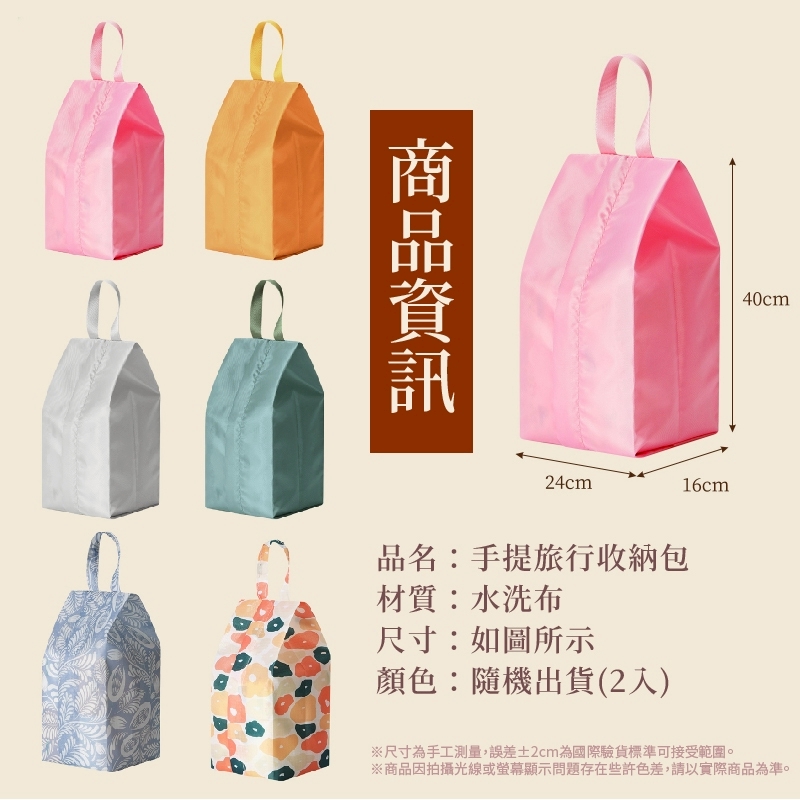 ✨內衣襪子、化妝品、拖鞋全收進去~出遊超有序! 🎒 輕裝出行收納神器✨出門再多小物也不怕! ✔ 超大開口設計|拿取超方便,一目了然 ✔ 分類收納不亂糟|內衣、襪子、化妝包、盥洗包分類搞定 ✔ 加厚手提不勒手|外出、上班、露營都實用 ✔ 柔韌水洗布材質|輕巧防潑水,清潔方便、摺疊收納也OK 💡【使用情境百變多功能】 👙 旅行內衣收納包 🧦 辦公/健身換洗包 🧴 彩妝保養外出包 🥿 拖鞋或備用鞋收納包 🎁 也可作為送禮自用的實用好物! 【★商品規格】 產地:PRC(台灣監製) 材質:水洗布 規格:24x16x40cm±3%(2入) 顏色:顏色眾多不及備載,隨機出貨