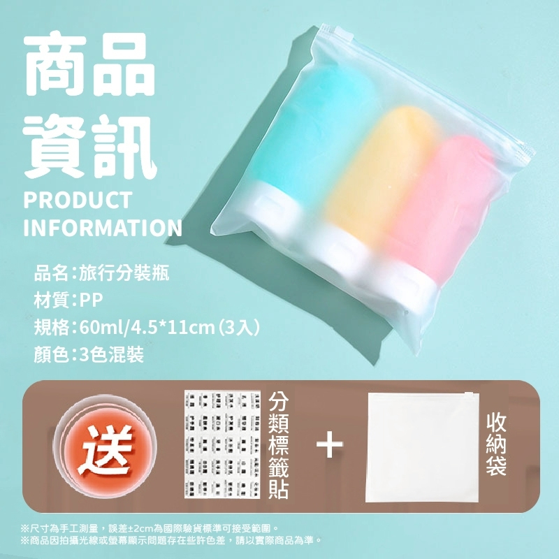 🌸【木棉花】糖果系乳液旅行分裝瓶3入組(送標籤跟收納袋) 💖 旅行控、健身控必收的夢幻小物! 🎁 加送收納袋+分類標籤貼,好貼心! 🍭 粉嫩糖果系外觀 × 超強實用性 ✔ 小巧便攜:60ml剛剛好,出差、旅行、健身都能帶 ✔ 輕鬆按壓:柔軟有彈性,反覆擠壓也不變形 ✔ 雙重防漏設計:安心放包包,不怕灑滿行李 ✔ 寬口徑設計:分裝不手忙腳亂,加料超輕鬆 ✔ 出液順暢:乳液、洗面乳、沐浴乳通通搞定 ✔ 可上飛機:容量剛好,不怕安檢卡關 ✨ 一組搞定所有分裝需求 👉 乳液 ✔ 洗髮精 ✔ 沐浴乳 ✔ 卸妝油 ✔ 不再大瓶小瓶佔空間,出門更清爽! 💡 糖果系外型,旅行包裡的亮點小物! 💖 不只好用,還超可愛~看了心情都變好! 【★商品規格】 品名:乳液分裝瓶 材質:PP 規格:60ml/4.5*11cm(3入) 顏色:隨機