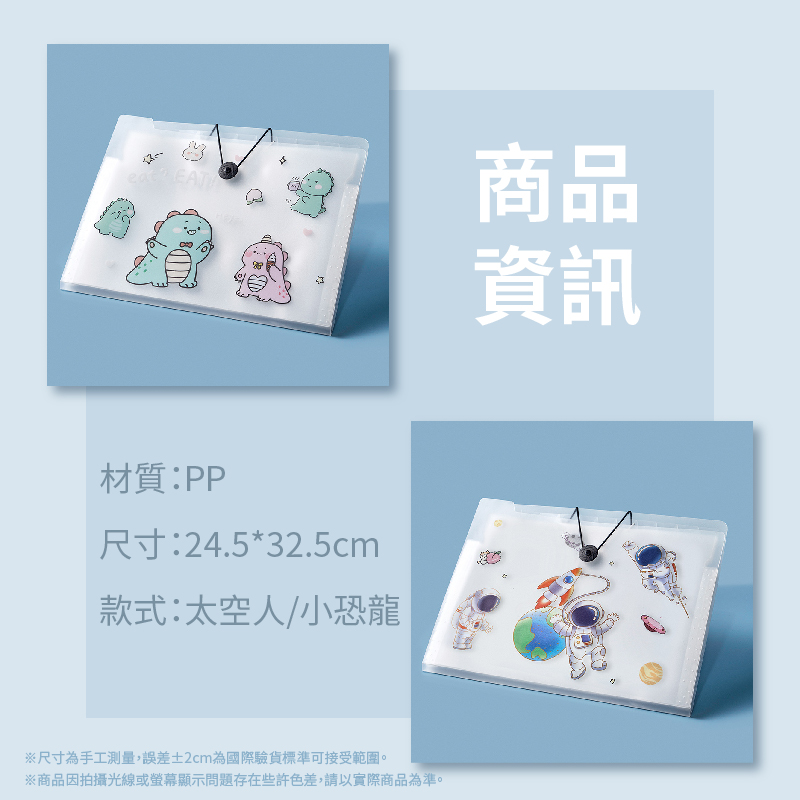 🌸【木棉花】大容量風琴式12格文件收納夾 🧑🚀 共2款:太空人 、 小恐龍 🔥開學或工作再忙,整理文件從此不煩惱! 📚學期初、工作繁忙,文件亂成一團? 有了這款文件資料收納夾,輕鬆整理試卷、考卷、工作文件,一目了然! 12個獨立格子,讓每份資料都有專屬位置,告別凌亂,提升效率,輕鬆找資料! 🌟 可愛有趣設計 宇航員與小恐龍款式,讓整理不再枯燥,開學或辦公桌上都能帶來一點小確幸! 💡 為什麼選擇我們的資料收納夾? ✔ 12格設計,分類清晰,資料一目了然 ✔ PP材質,耐用又輕便,長時間使用也不怕損壞 ✔ 24.5*32.5cm大尺寸,不論是大尺寸文件還是小小紙張,通通 都能收納! ✔ 送索引貼,讓標記分類更簡單 ✔ 微笑扣按鈕設計,方便快速拿取每一格文件 ✔ 防水耐髒,即使長時間使用也能保持清潔 🎨 設計款式可愛,讓文件整理不再枯燥,開學、工作兩不誤! 【★商品規格】 產地:PRC(台灣監製) 材質:PP 尺寸:24.5x32.5cm